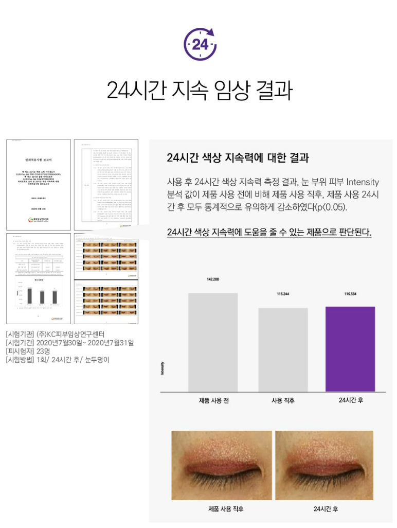 24시간 색상 지속력에 대한 결과 눈 부위 피부 Intensity 분석 값이 제품 사용 전에 비해 제품 사용 직후, 제품 사용 24시간 후 모두 통걔쩍으로 유의하게 감소하였음을 알 수 있었어요. 즉 24시간 색상 지속력에 도움을 줄 수 있는 제품으로 판명되었어요.