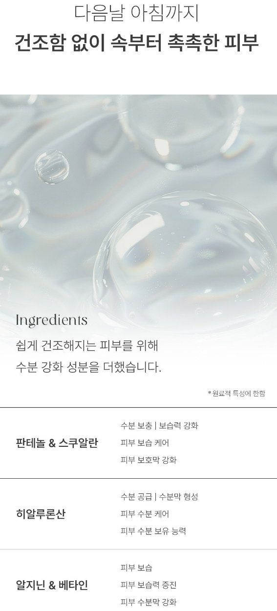판테놀, 스쿠알란, 히알루론산, 알지닌, 베타인 성분 등 쉽게 건조해지는 피부를 위해 수분 강화 성분을 더했어요.