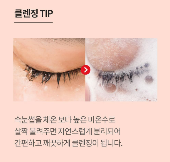 속눈썹을 체온 보다 높은 미온수로 살짝 불려주면 자연스럽게 분리되어 간편하고 깨끗하게 클렌징이 돼요.