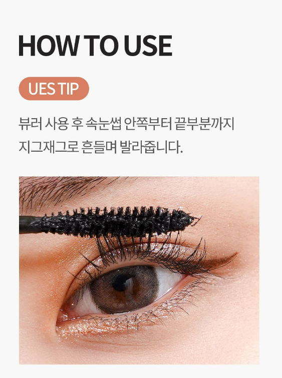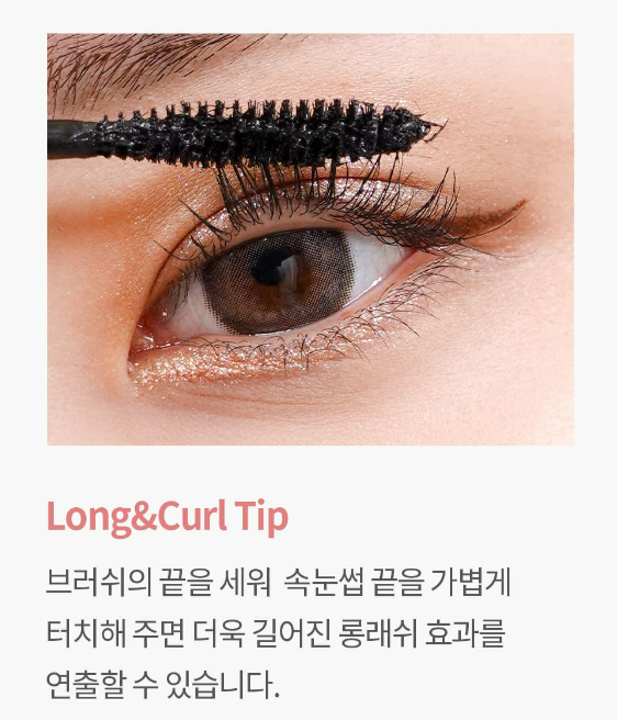 뷰러 사용 후 속눈썹 안쪽부터 끝부분까지 지그재그로 흔들며 발라주세요. 롱앤컬의 경우, 브러쉬의 끝을 세워 속눈썹 끝을 가볍게 터치해주면 더욱 길어진 롱래쉬 효과를 연출할 수 있어요. 볼륨앤컬은 브러쉬에 내용물을 골고루 취해 속눈썹 바깥쪽도 함께 빗어주면 더욱 풍성하고 볼륨감 넘치는 속눈썹을 표현하실 수 있어요.