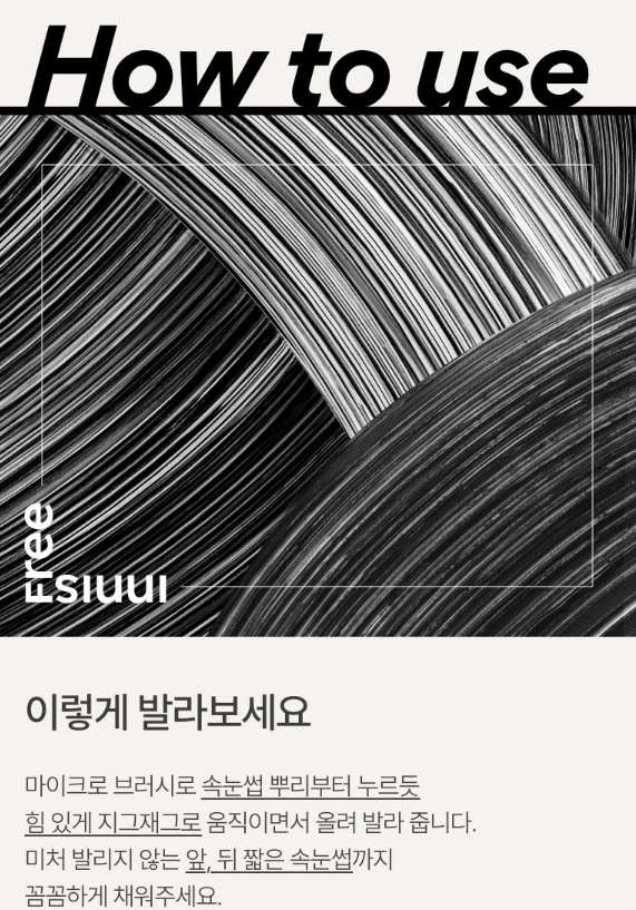 마이크로 브러쉬로 속눈썹 뿌리부터 누르듯 힘 있게 지그재그로 움직이면서 올려 발라주세요. 미처 발리지 않는 앞, 뒤 짧은 속눈썹까지 꼼꼼하게 채워주세요.