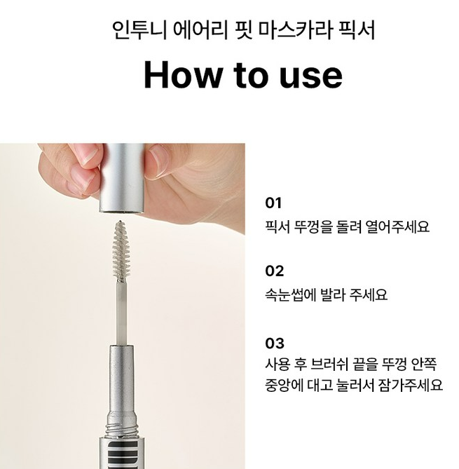 인투니 투명 마스카라 픽서는 마스카라 사용 전 픽서처럼 사용하여 고정력을 높여줄 수 있어요. 또 마무리 코팅제로도 활용이 가능해서 마스카라 후, 번짐 방지 코팅용으로도 활용하실 수 있어요.