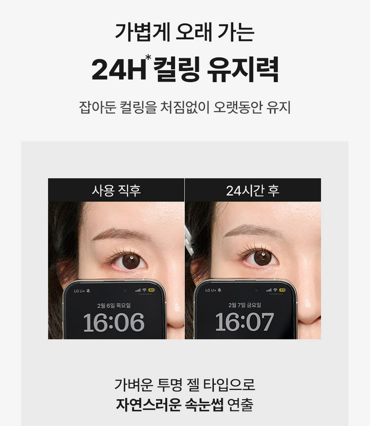 가벼운 투명 젤타입으로 자연스러운 속눈썹을 연출할 수 있고 잡아둔 컬링을 처짐없이 오랫동안 유지해줘요.