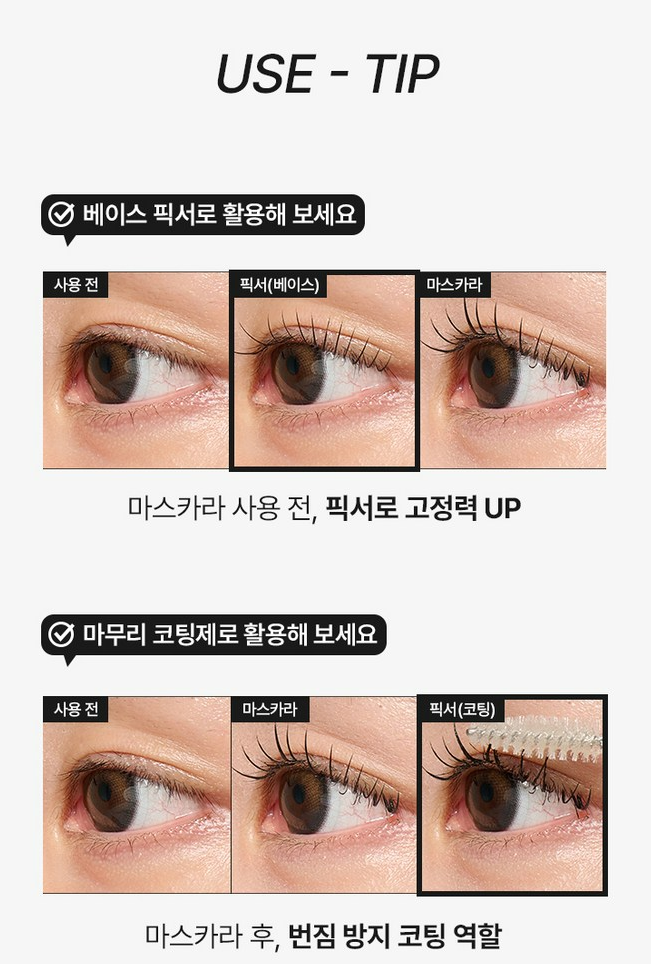 단독으로도 사용이 가능하고 마스카라와 함께 픽서 혹은 코팅제로도 사용할 수 있어 활용도가 높아서 좋은 것 같아요.