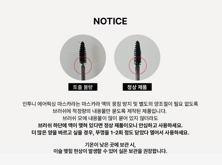 인투니 마스카라는 마스카라 액의 뭉침 방지 및 별도의 양조절이 필요 없도록 브러쉬에 적정량의 내용물만 묻도록 제작된 제품이에요. 브러쉬 모에 내용물이 많이 묻어 있지 않더라도 브러쉬 하단에 액이 맺혀 있다면 정상 제품이니 안심하고 사용하셔도 돼요.