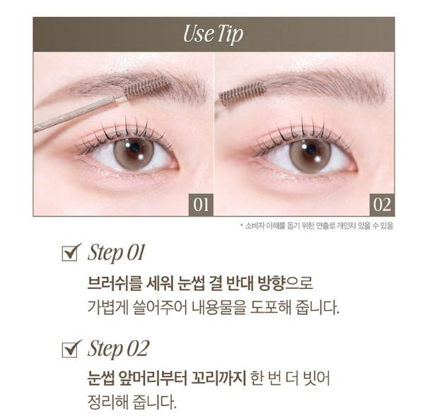 먼저 브러쉬를 세워 눈썹 결 반대 방향으로 가볍게 쓸어주며 내용물을 도포해주세요. 그 다음 눈썹 앞머리부터 꼬리까지 한 번 더 빗어서 정리해주세요.