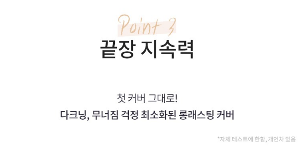 첫 커버 그대로 다크닝과 무너짐 걱정을 최소화한 롱래스팅 커버가 특징적이에요.