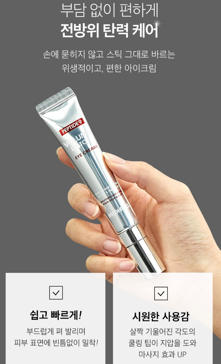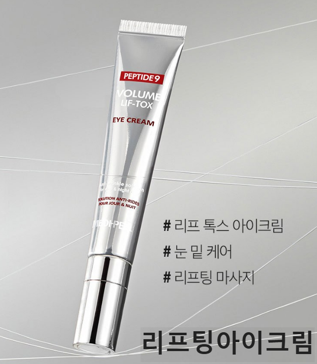 눈 밑 처지는 살을 케어하고 눈꼬리 리프팅 케어를 위해서는 리프팅아이크림을 사용하시면 좋은데요. 오늘 소개해드릴 메디필 리프팅아이크림은 펩타이드9 성분과 제품에 같이 달려있는 메탈 어플리케이터로 동시에 마사지를 할 수 있는 제품이에요.