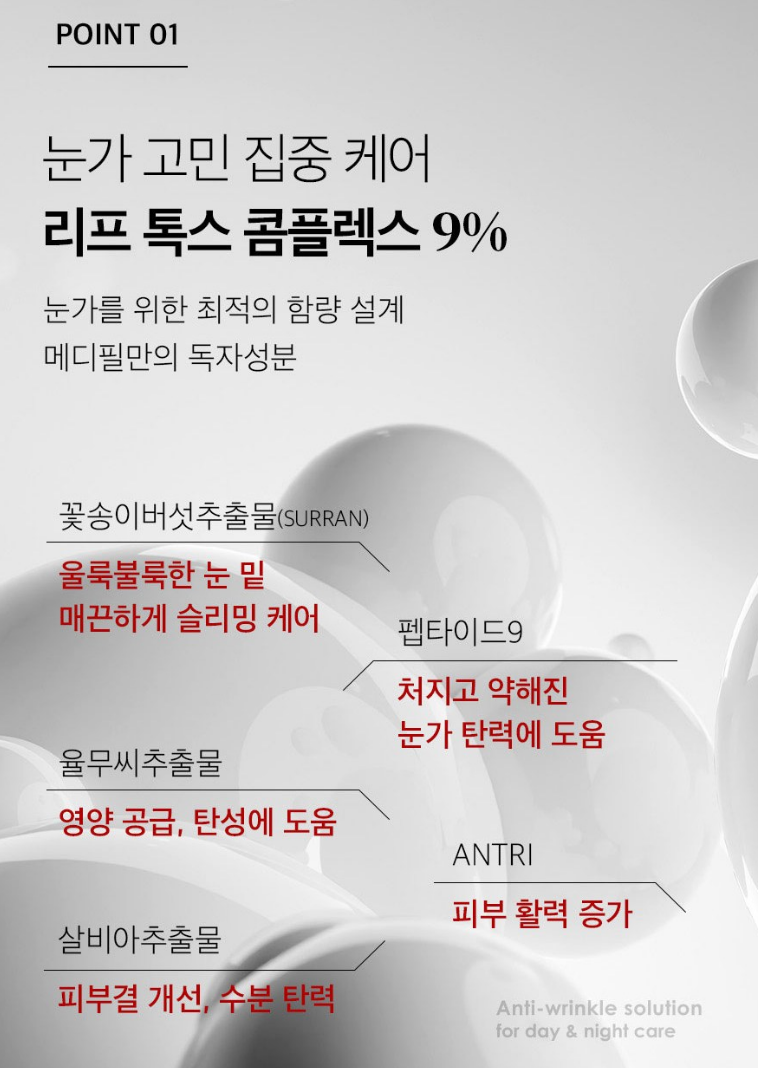 꽃송이버섯추출물과 펩타이드9 등을 포함하는 탄력, 리프팅을 위한 메디필만의 독자 성분인 리프 톡스 콤플렉스 9%는 눈 밑 살 케어, 눈가 탄력, 눈꼬리 리프팅, 수분 충전 등의 효과를 줘요.