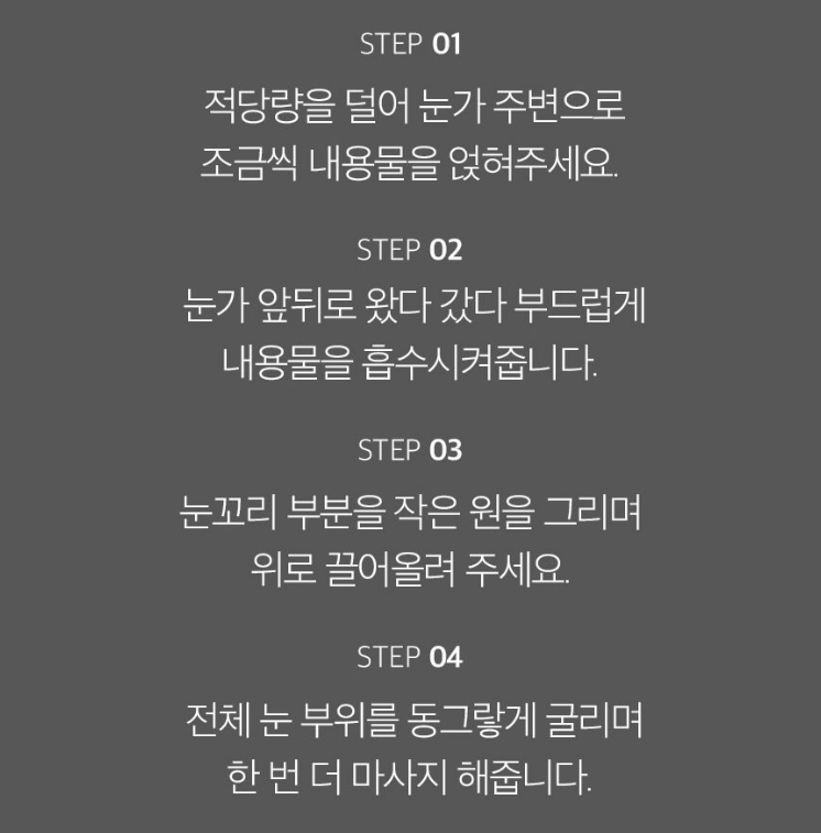 적당량을 덜어 눈가 주변으로 조금씩 내용물을 얹혀주세요. 눈가 앞뒤로 왔다 갔다 부드럽게 내용물을 흡수시켜주시고, 눈꼬리 부분을 작은 원을 그리며 위로 끌어올려 주세요. 전체 눈 부위를 동그랗게 굴리며 한 번 더 마사지 해주세요.
