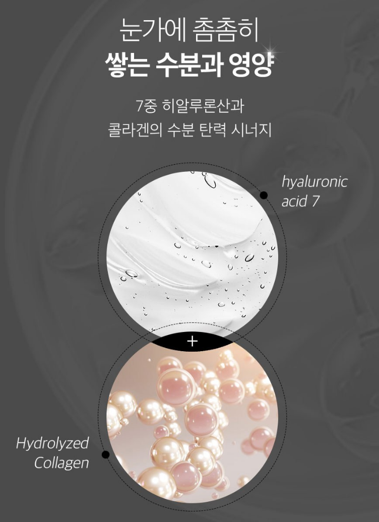 7중 히알루론산과 콜라겐의 수분 탄력 시너지로 눈가에 촘촘하게 수분을 쌓아줘요.