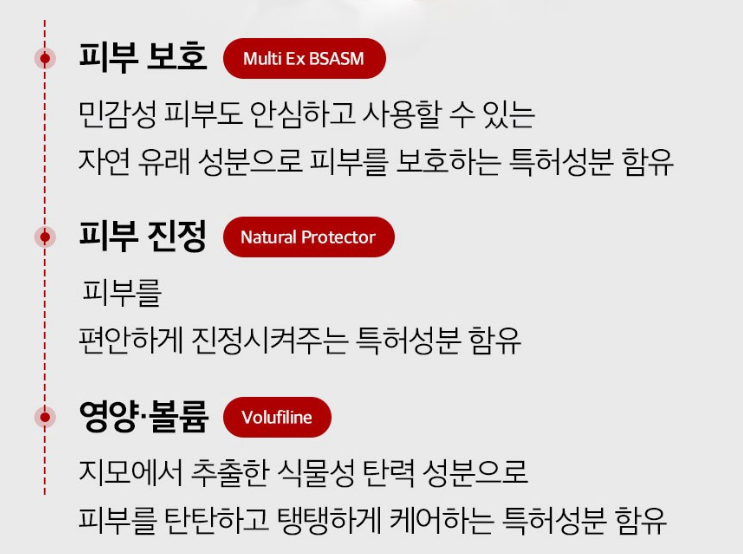 민감성 피부도 안심하고 사용할 수 있는 자연 유래 성분으로 피부를 보호하는 특허 성분을 함유하고 있어요. 피부를 편안하게 진정 시켜주는 특허성분과 지모에서 추출한 식물성 탄력 성분으로 피부를 탄탄하고 탱탱하게 케어하는 특허성분도 함유하고 있어요.