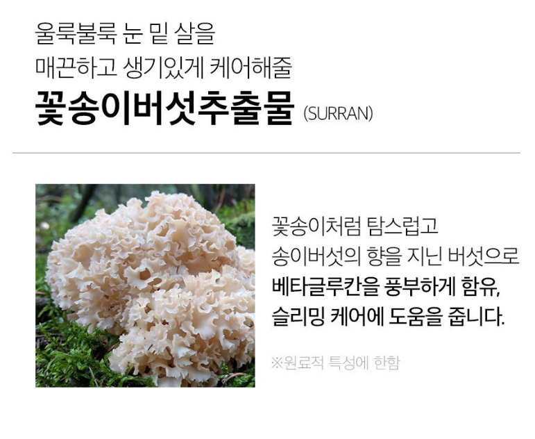 꽃송이버섯추출물 성분은 베타글루칸을 풍부하게 함유하고 있어 울룩불룩 눈 밑 살을 매끈하고 생기있게 해주는 슬리밍 케어에 도움을 줘요.