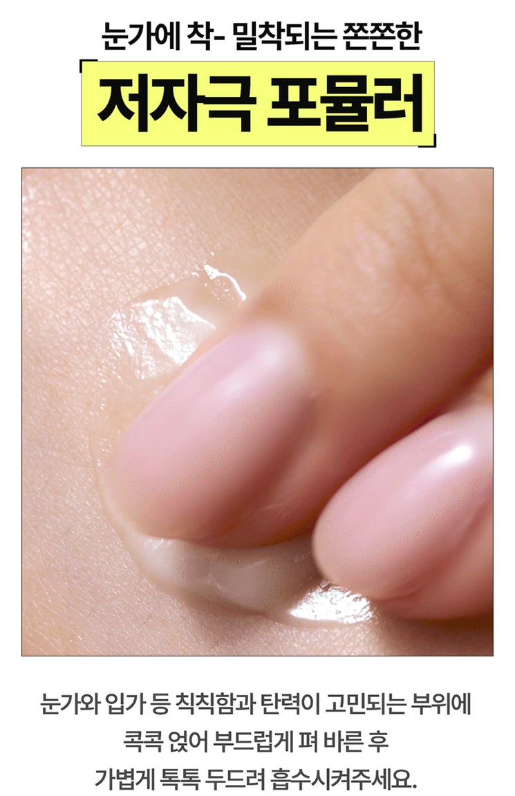 눈가에 착- 밀착되는 쫀쫀한 저자극 포뮬러예요. 눈가와 입가 등 칙칙함과 탄력이 고민 되는 부위에 콕콕 얹어 부드럽게 펴 바른 후 가볍게 톡톡 흡수시켜주세요.