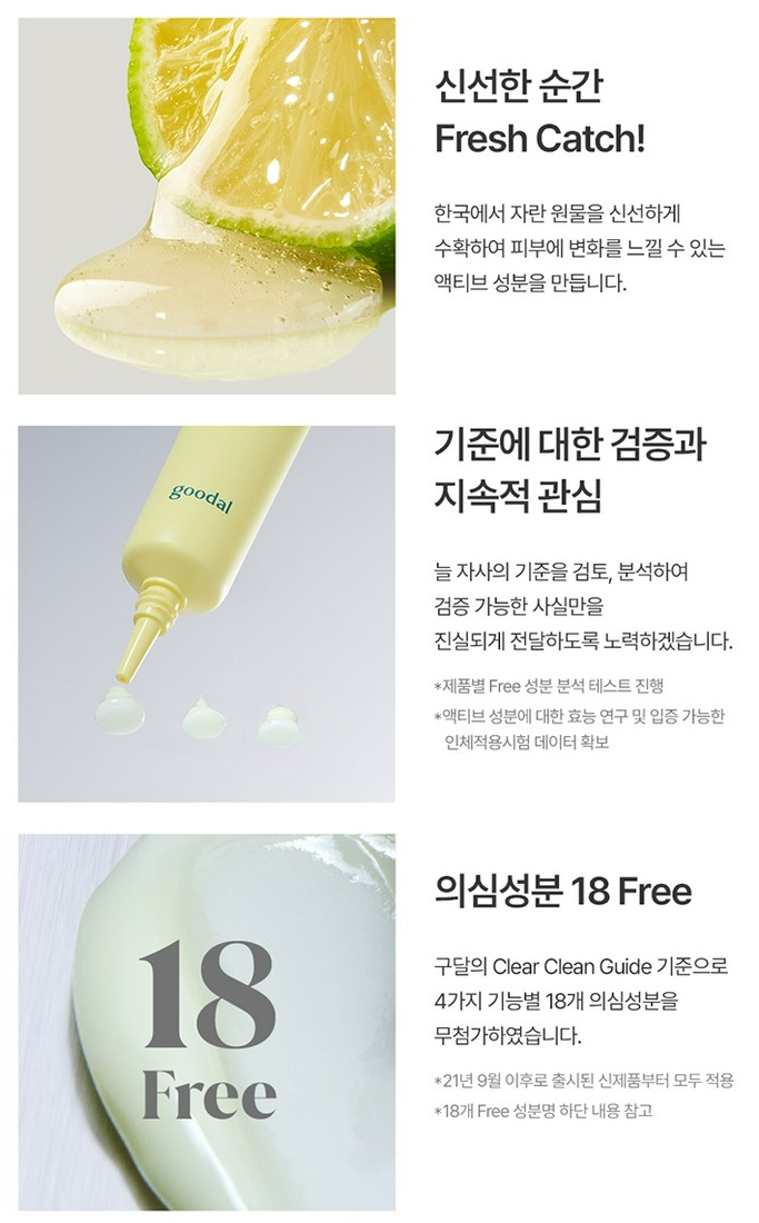 구달은 한국에서 자란 원물을 신선하게 수확하여 제품을 만들고, 늘 지속적으로 기준에 대한 검토 및 분석을 이어오고 있어요. 또한 구달의 4가지 기능별 18개 의심성분을 무첨가 하였어요.