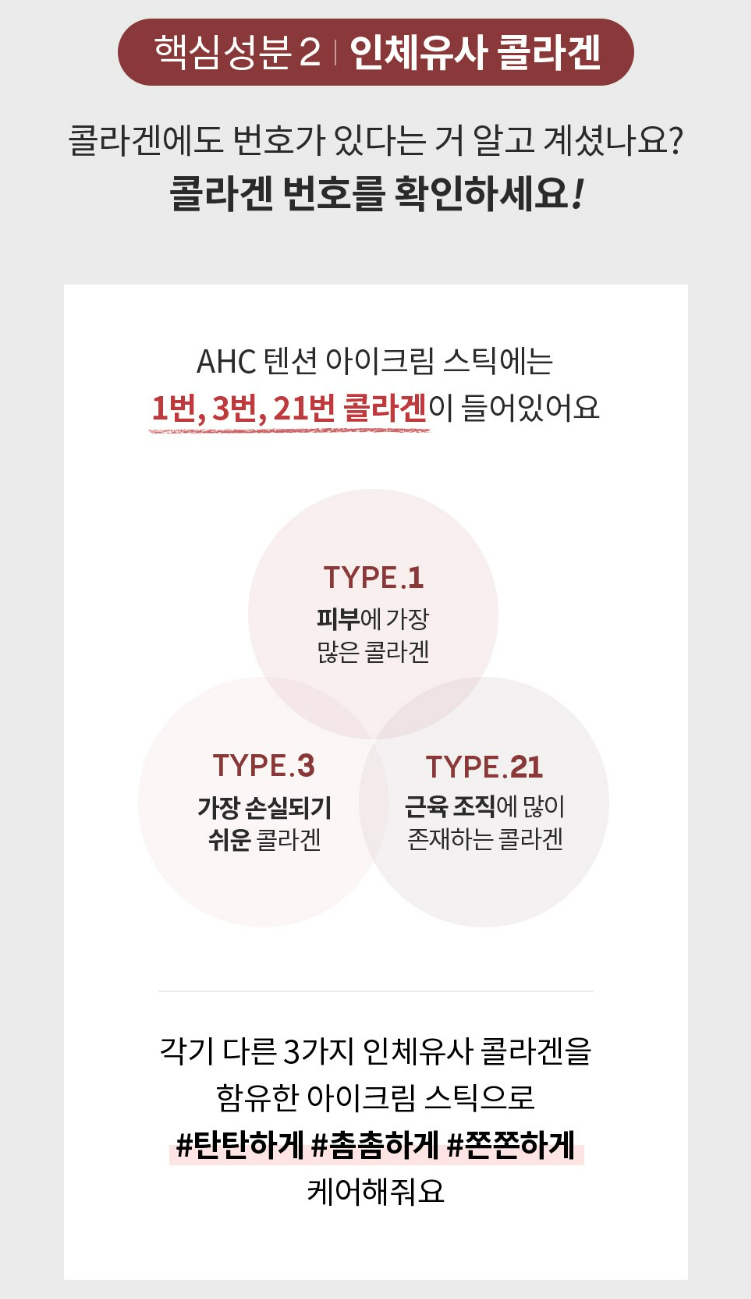 각기 다른 3가지 인체 유사 콜라겐을 함유한 아이크림 스틱으로 탄탄하고 촘촘, 쫀쫀하게 케어해줘요.