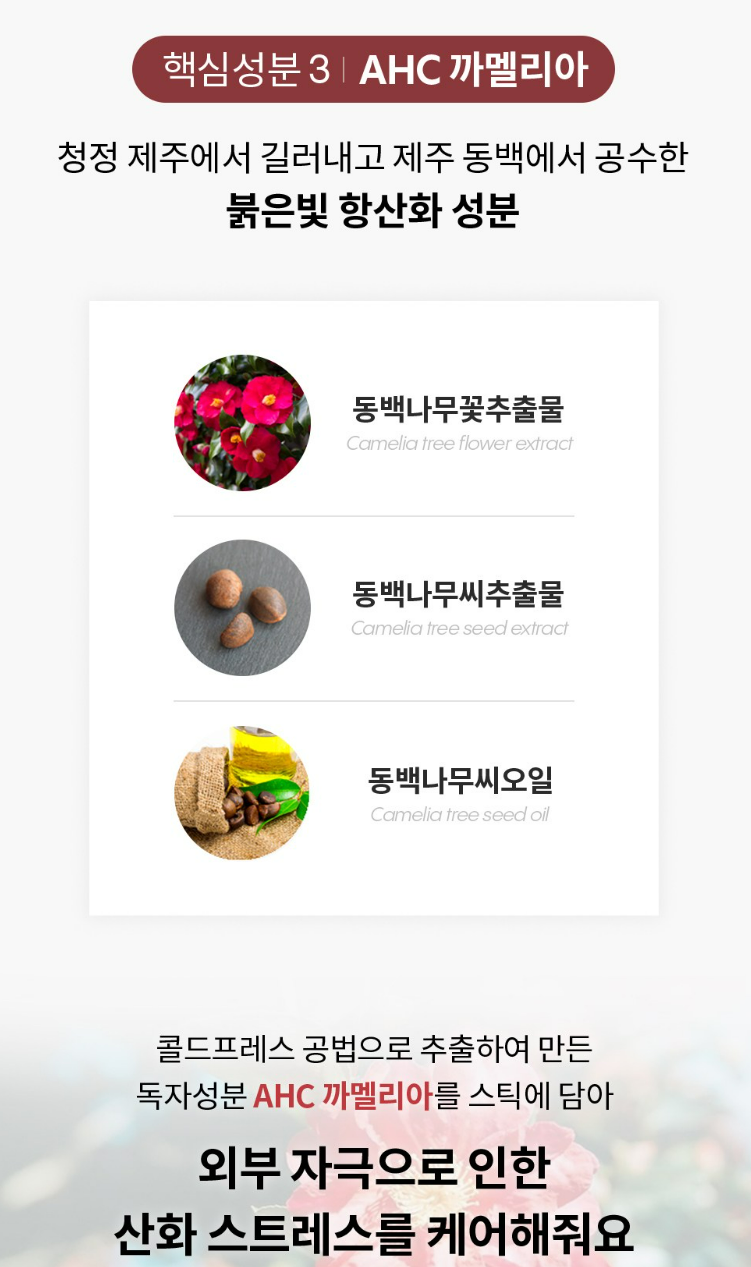 동백나무꽃추출물, 동백나무씨추출물, 동백나무씨오일 성분을 콜드프레스 공법으로 추출하여 AHC만의 까멜리아 성분으로 만들었어요. 이를 스틱에 담아 외부 자극으로 인한 산화 스트레스를 케어해줘요.