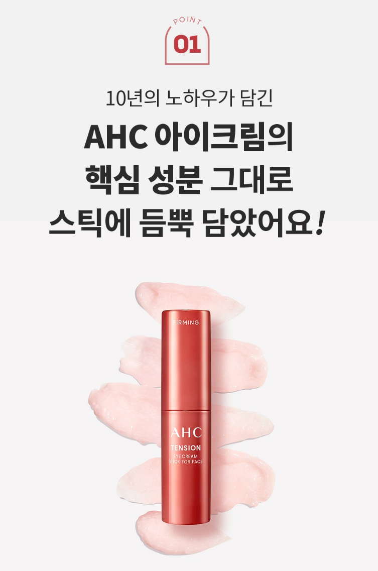 이 제품은 수시로 편하게 바를 수 있는 스틱 형태로 간편하게 눈가탄력과 주름 등을 케어할 수 있어요. 그럼 지금부터 AHC 스틱 아이크림 집중해서 봐주세요. ^^