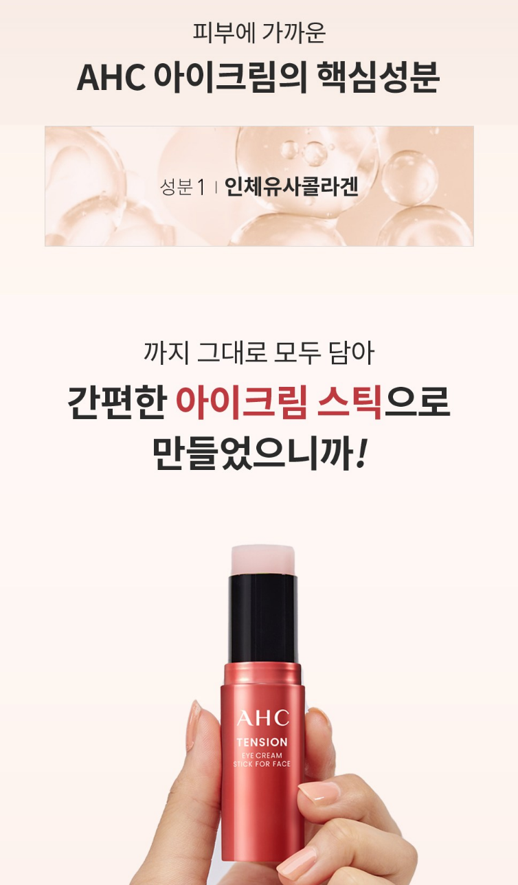AHC 아이크림의 핵심 성분인 인체 유사 콜라겐을 그대로 모두 담아 간편한 아이크림 스틱으로 만들었어요.