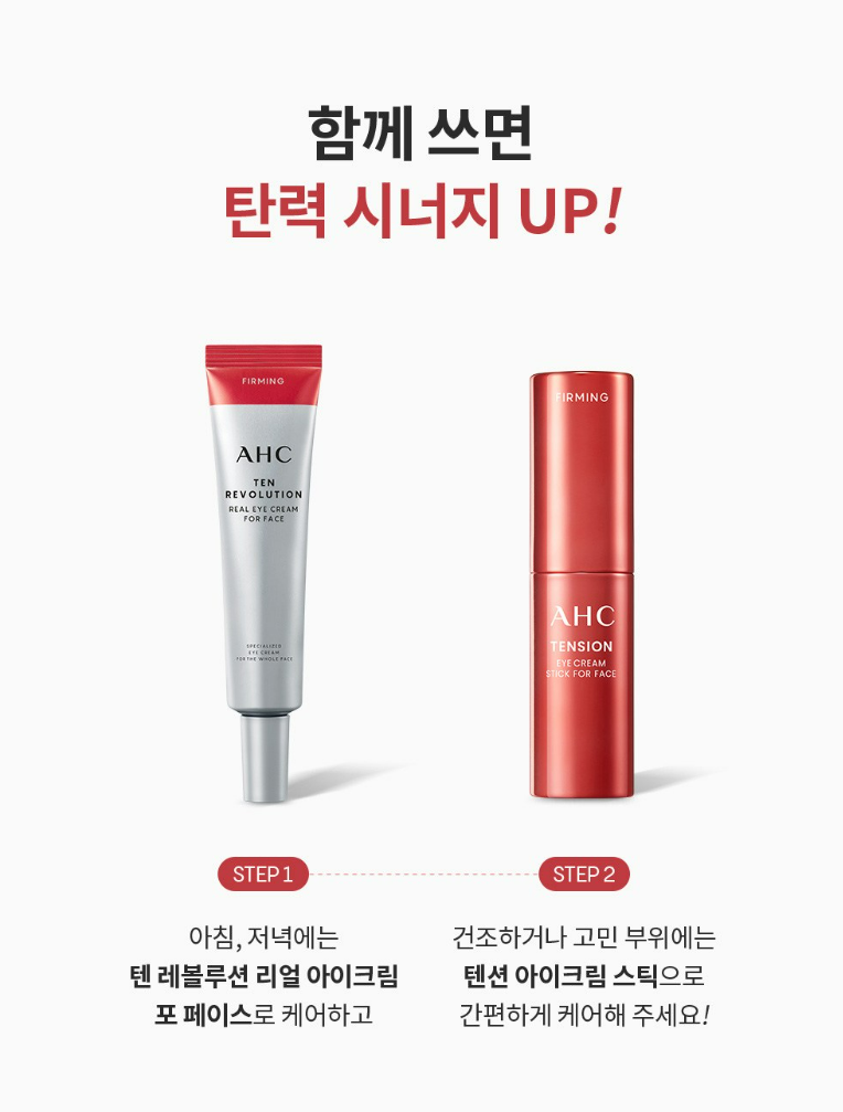 아침 저녁으로 텐 레볼루션 리얼 아이크림 포 페이스로 케어하고 건조하거나 고민 부위에는 텐션 아이크림 스틱으로 케어해보세요.