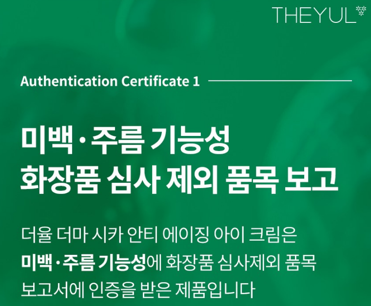 더율 더마 시카 안티 에이징 아이크림은 미백/주름 기능성에 화장품 심사제외 품목 보고서에 인증을 받은 제품이에요.