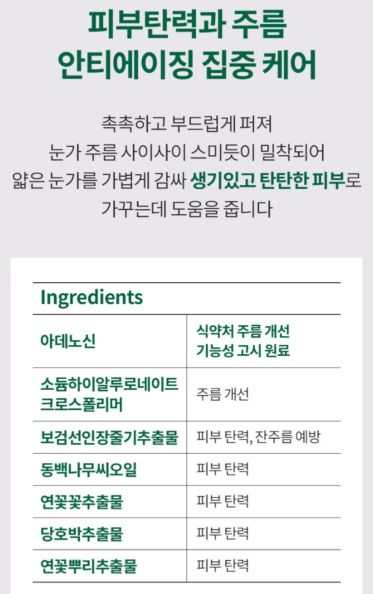병풀추출물과 각종 식물성 추출물이 함유되어 메마르고 건조한 눈가 피부에 영양과 수분을 채워주고 나이아신아마이드와 아데노신이 함유되어 미백과 주름개선에 도움을 주는 아이크림이에요.