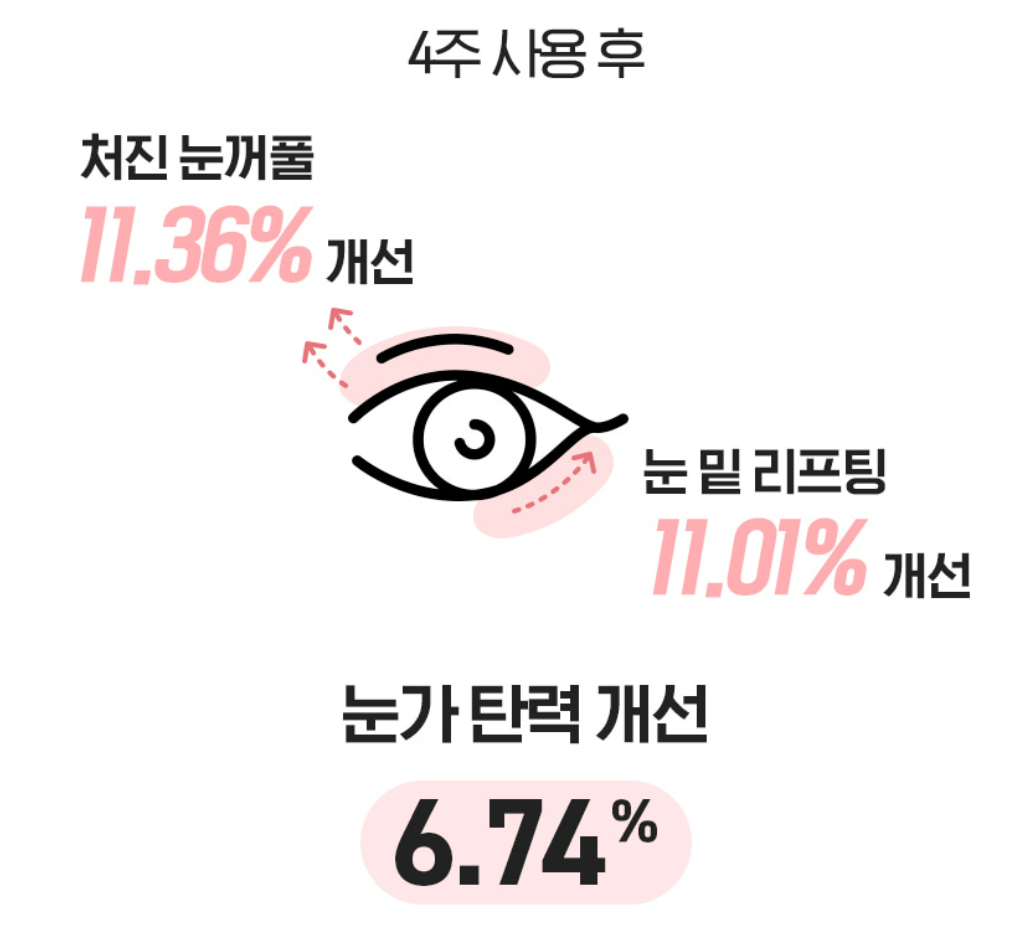 4주 동안 꾸준히 사용한 결과, 처진 눈꺼풀, 눈 밑 리프팅 등이 개선되어 눈가 탄력이 전체적으로 개선되었음을 알 수 있어요.