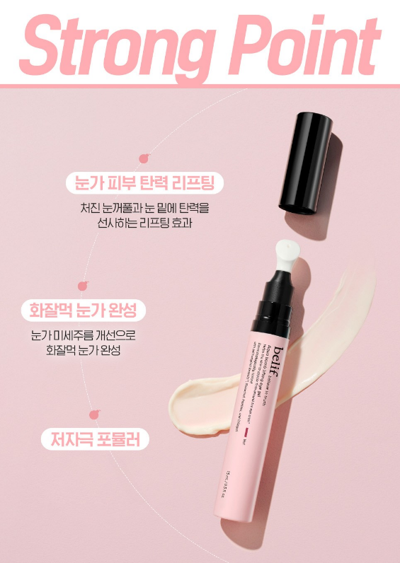 눈가 피부 탄력 리프팅, 눈가 미세 주름 개선을 통한 화잘먹 눈가 완성, 저자극 포뮬러가 가장 큰 특징 3가지예요.