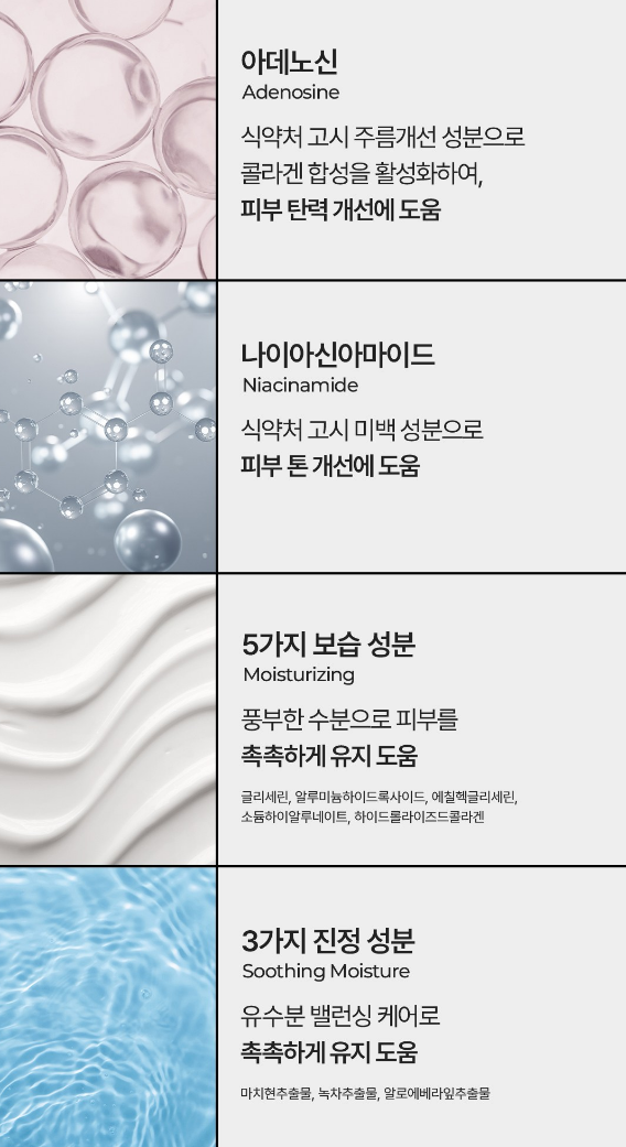 아데노신, 나이아신아마이드, 5가지 보습 성분, 3가지 진정 성분, 자외선 차단력까지 갖춰 피부 톤 정돈과 보습 및 진정에 도움을 주고 자외선 차단까지 한 번에 해결할 수 있어요.