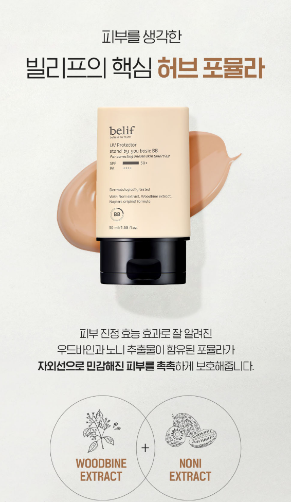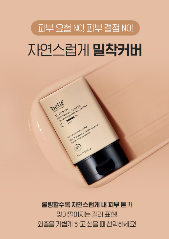 가까운 곳을 나갈 때 파운데이션까지는 부담스러우시다면 빌리프 베이직 비비크림을 사용하시면 좋아요. 선크림과 메이크업을 한 번에 해결할 수 있고 촉촉하지만 번들거림 없는 메이크업을 완성할 수 있어요.