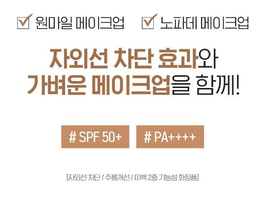 원마일 메이크업과 노파데 메이크업을 함께 완성할 수 있어요. 자외선 차단 효과를 포함하고 있어 더운 여름날 가벼운 메이크업을 할 수 있어요.