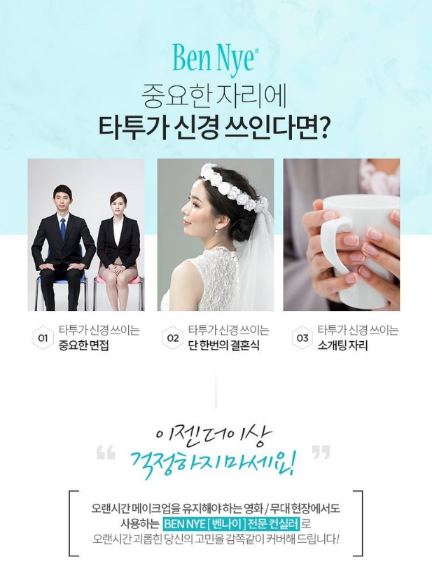 중요한 면접이나 결혼식, 소개팅 자리 등 타투가 신경쓰이고 걱정되는 자리가 있을 때, 오랜시간 메이크업을 유지해야하는 영화나 무대현장에서도 사용하는 벤나이 전문 컨실러가 감쪽같이 커버해줘요!