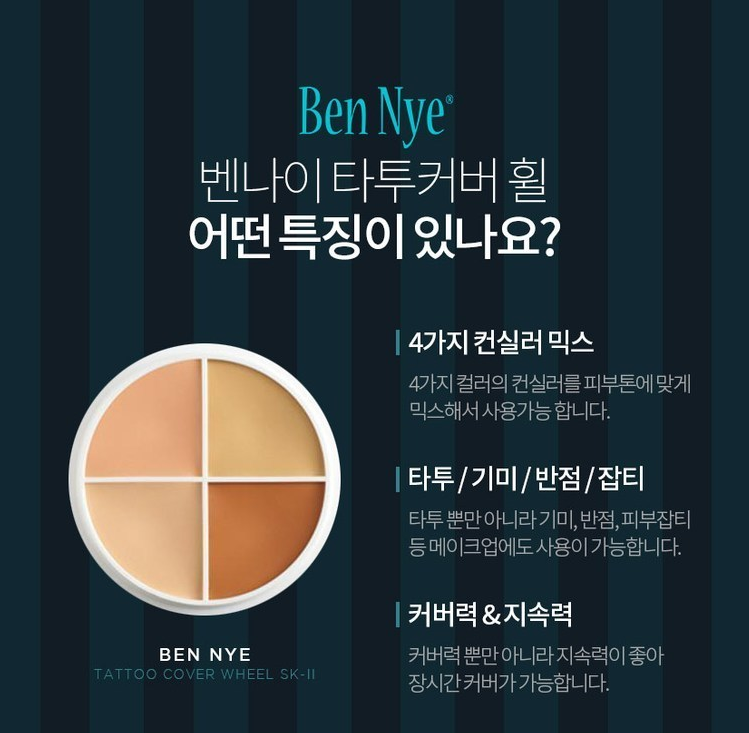 위 나온 제품들은 벤나이에서 판매되는 다른 제품인데요. 진한 색소를 잡기 위해 짙은 색상의 컨실러를 먼저 올려주고 파우더 처리를 해준 후 3번째 단계에서 타투커버 휠 제품으로 꼼꼼히 덮어줘요. 이후 파운데이션과 픽서로 고정시켜주면 더욱 자연스럽고 완벽하게 사용할 수 있답니다!
