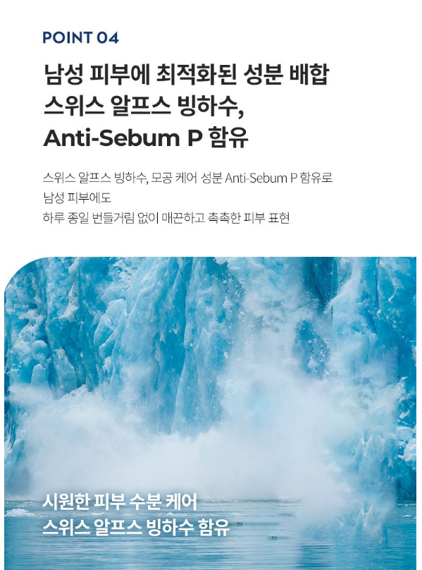 스위스 알프스 빙하수, 모공 케어 성분 Anti - Serun P 함유로 남성 피부에도 하루종일 번들거림 없이 매끈하고 촉촉한 피부 표현이 가능해요.