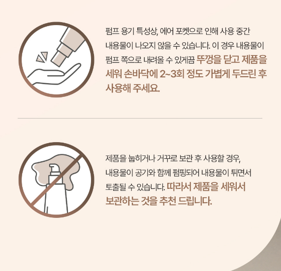 펌프 용기의 특성상, 사용 중간 내용물이 나오지 않을 수 있는데요. 이 경우 뚜껑을 닫고 제품을 세워 손바닥에 2~3회 정도 가볍게 두드린 후 사용해 주세요. 제품을 눕히거나 거꾸로 보관할 경우, 내용물이 공기와 함께 펌핑되어 내용물이 튀면서 토출될 수 있으니 제품을 세워서 보관해 주세요.