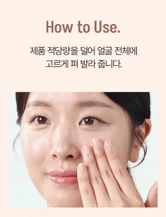 제품 적당량을 덜어 얼굴 전체에 고르게 펴 발라 주세요.