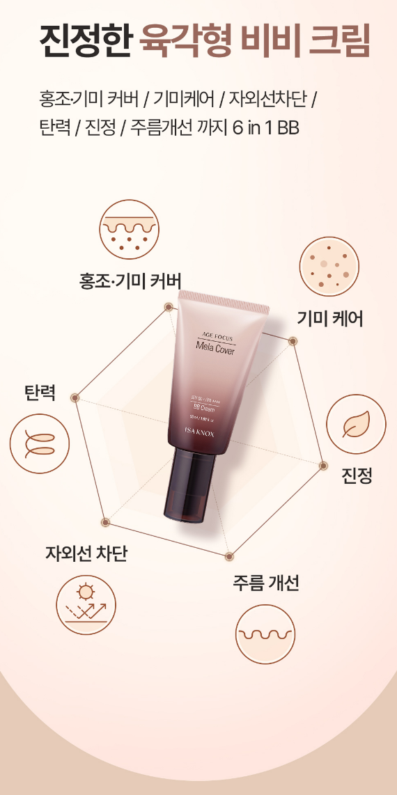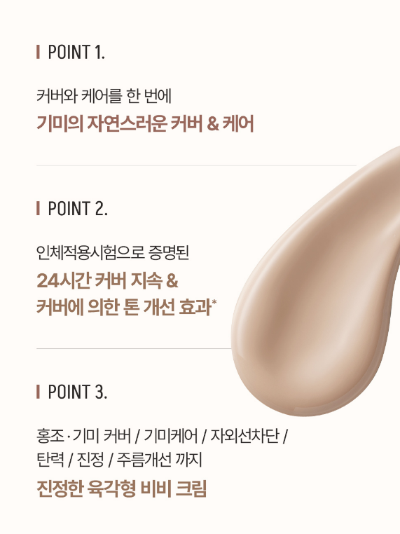 홍조/기미 커버, 기미 케어, 탄력, 진정, 자외선 차단, 주름 개선등이 가능한 6 IN 1 비비크림이에요.