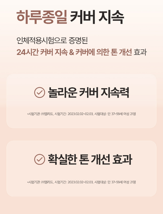 24시간 커버 지속과 커버애 의한 톤 개선 효과가 인체적용시험으로 증명되었어요.