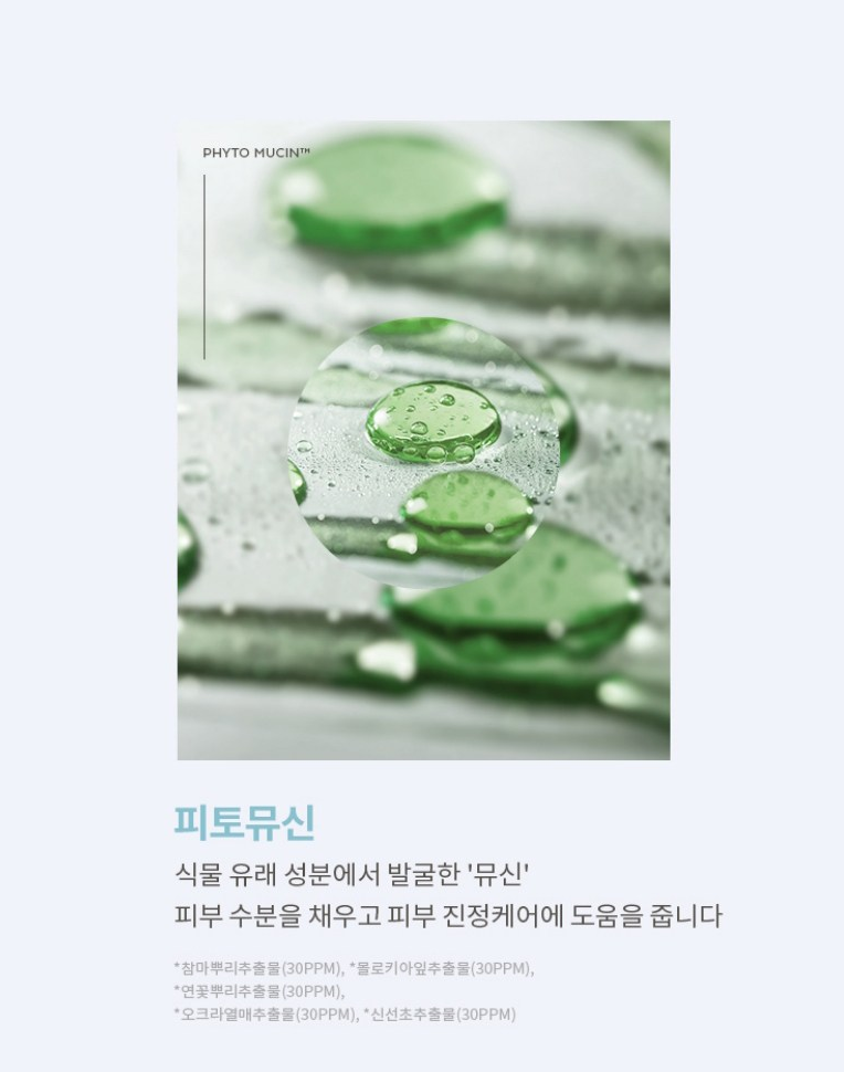 피토뮤신은 식물 유래 성분에서 발굴한 성분으로 피부 수분을 채우고 피부 진정케어에 도움을 줘요.
