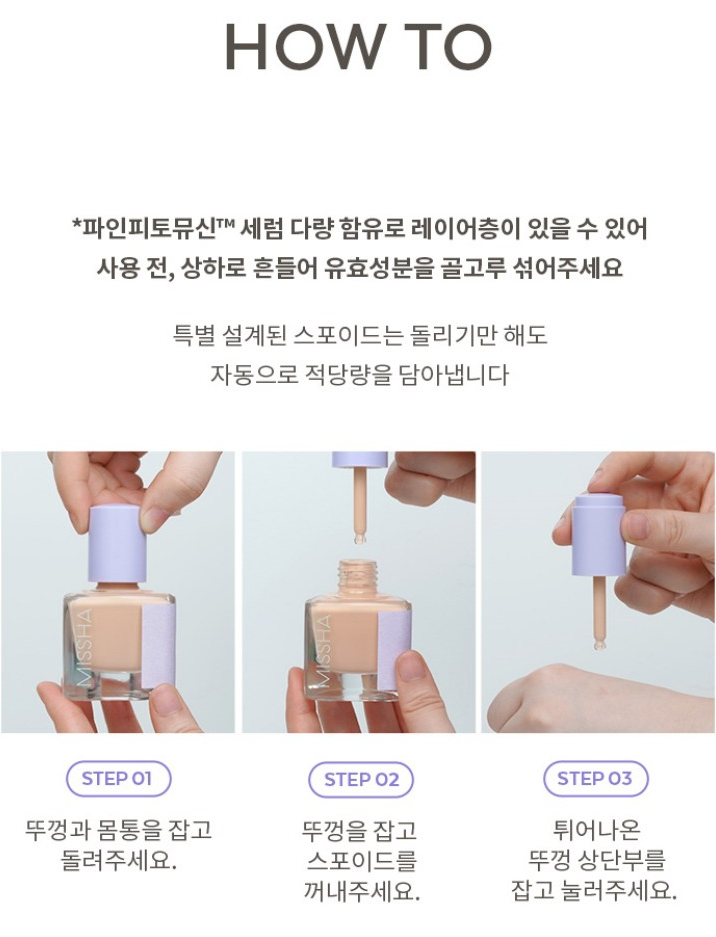 파인피토뮤신세럼 다량 함유로 레이어층이 있을 수 있어 사용 전, 상하로 흔들어 유효성분을 골고루 섞어주세요. 먼저 뚜껑과 몸통을 잡고 돌려주세요. 그 다음 뚜껑을 잡고 스포이드를 꺼내주세요. 튀어나온 뚜껑 상단부를 잡고 눌러주시면 돼요.