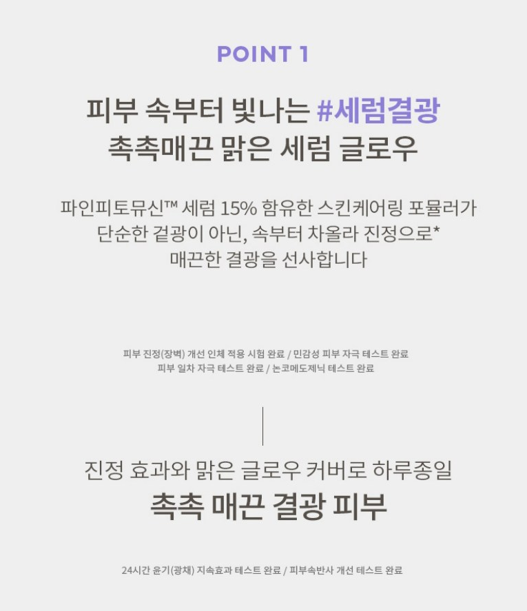 파인피토뮤신세럼 15% 함유한 스킨케어링 포뮬러가 단순한 겉광이 아닌 속부터 차올라 진정으로 매끈한 결광을 선사해줘요.