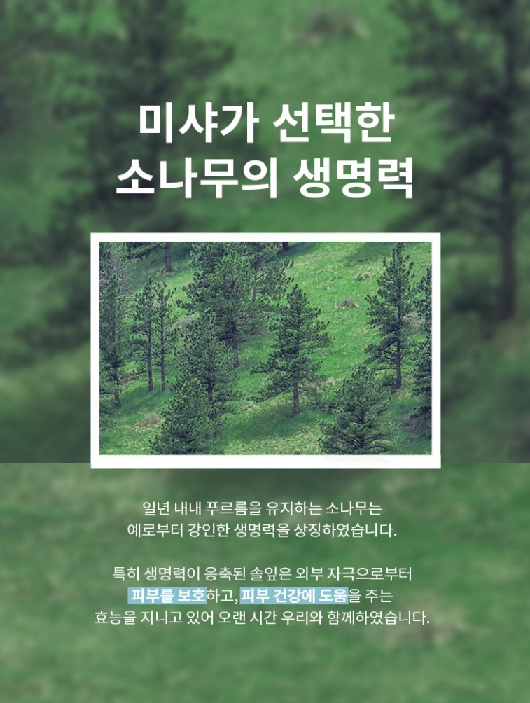 일년 내내 푸르름을 유지하는 소나무는 예로부터 강인한 생명력을 상징했는데요. 특히 생명력이 응축된 솔잎은 외부 자극으로부터 피부를 보호하고, 피부 건강에 도움을 주는 효능을 지니고 있어 오랜 시간 미샤와 함께했어요.