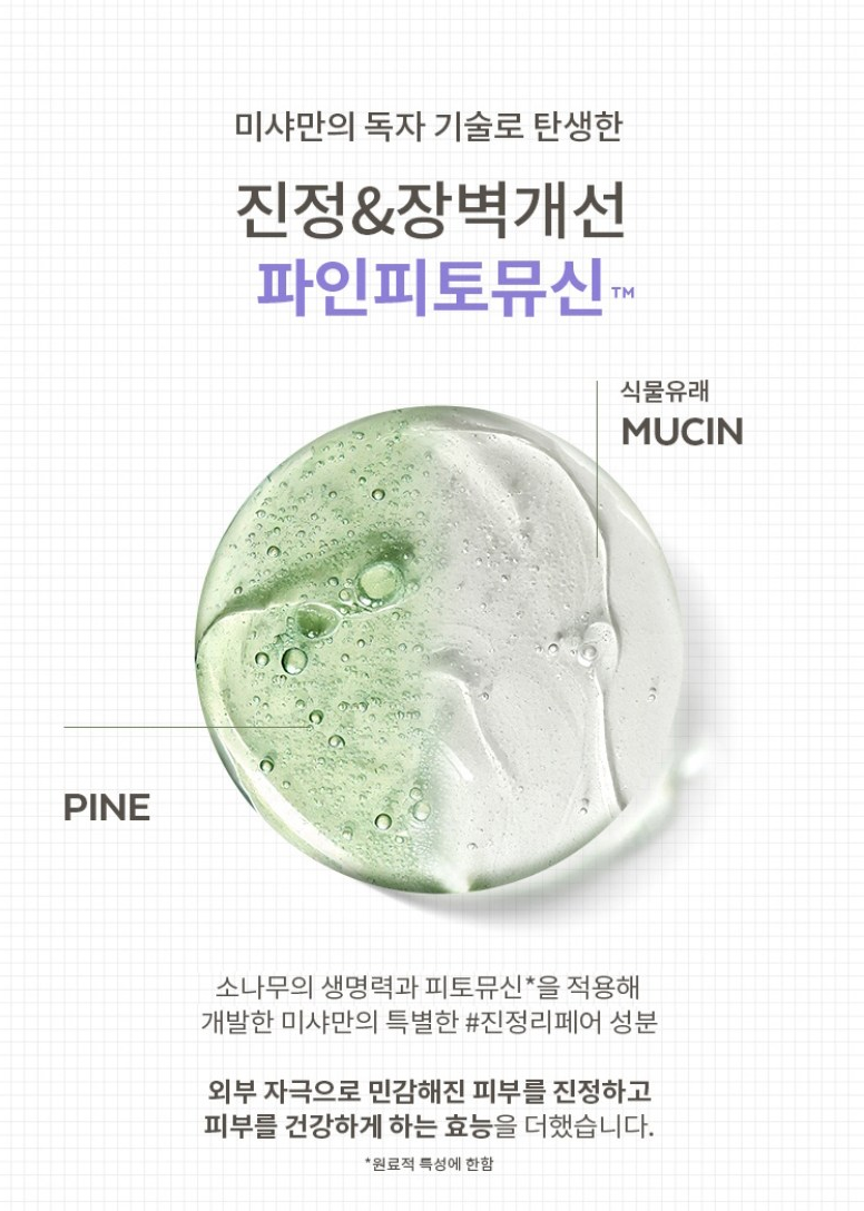 파인피토뮤신은 소나무의 생명력과 피토뮤신을 적용해 개발한 미샤만의 특별한 진정리페어 성분으로 외부 자극으로 민감해진 피부를 진정하고 피부를 건강하게 하는 효능을 더했어요.