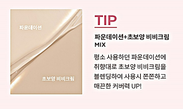 평소에 사용하던 파운데이션에 취향대로 초보양 비비크림을 블렌딩하여 사용시 쫀쫀하고 매끈하게 커버력을 높여보세요!