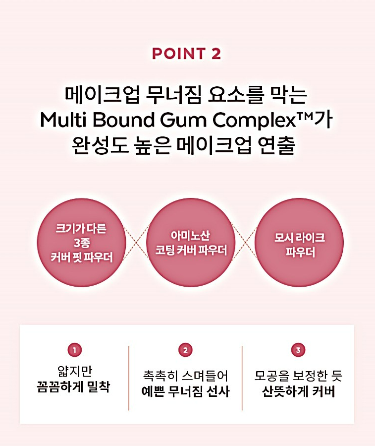 크기가 다른 3종 커버 핏 파우더, 아미노산 코팅 커버 파우더, 모시 라이크 파우더가 얇지만 꼼꼼하게 밀착시켜주고, 촉촉히 스며들어 예쁜 무너짐을 선사해줘요. 또한 모공을 보정한듯 산뜻하게 커버해준답니다!