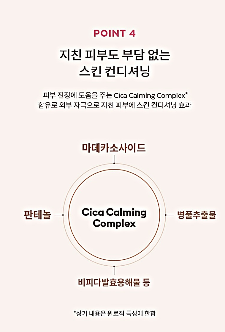 마데카소사이드, 판테놀, 병풀추출물, 비피다발효용해물 등이 포함되어 외부 자극으로부터 지친 피부에 스킨 컨디셔닝 효과를 줘요.
