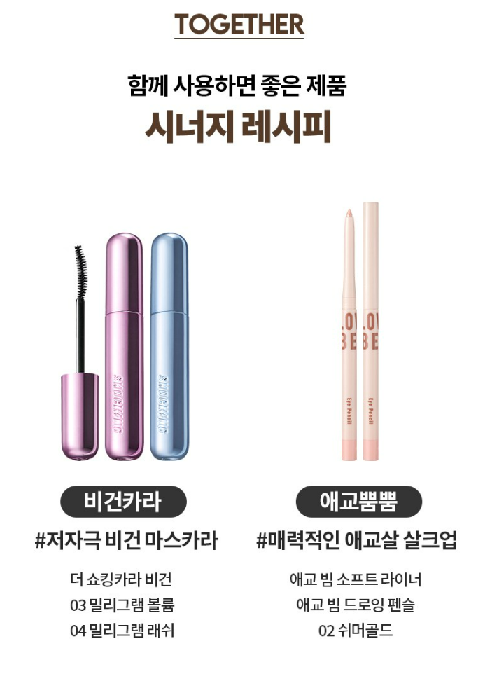 토니모리 더 쇼킹카라 비건과, 애교 빔 소프트 라이너를 함께 사용하시면 더 좋은 메이크업 효과를 내실 수 있어요.