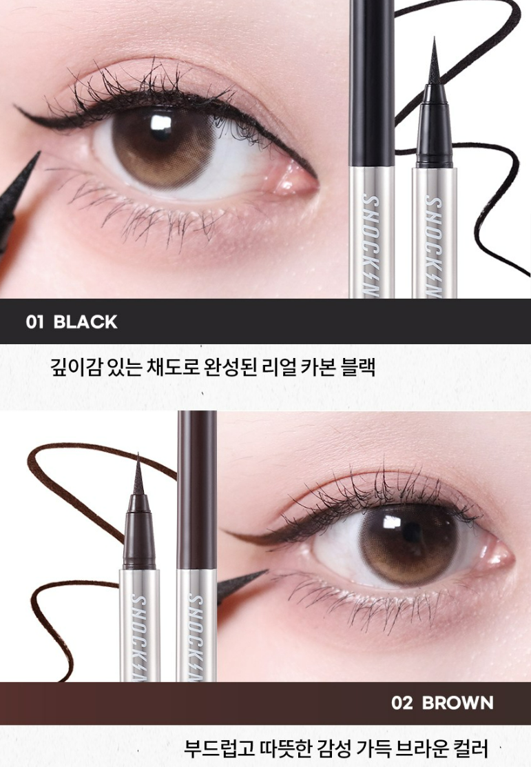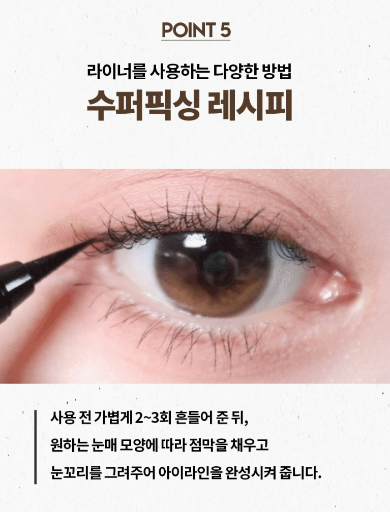 사용 전 가볍게 2~3회 흐들어 준 뒤, 원하는 눈매 모양에 따라 점막을 채우고 눈꼬리를 그려주어 아이라인을 완성시켜 주세요.