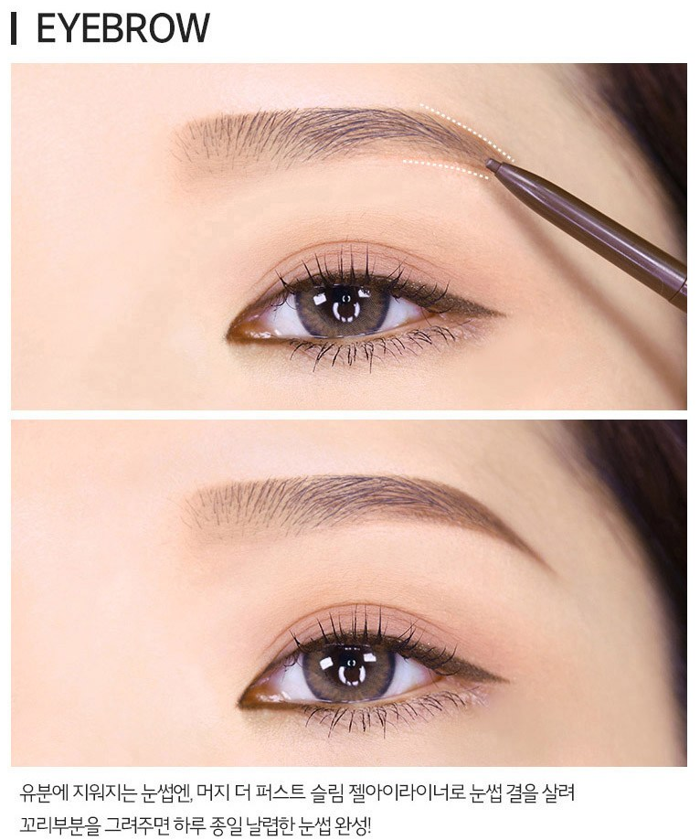 유분에 지워지는 눈썹에는 머지 더 퍼스트 슬림 젤 아이라이너로 눈썹 결을 살려 꼬리 부분을 그려주면 날렵한 눈썹을 완성할 수 있어요.