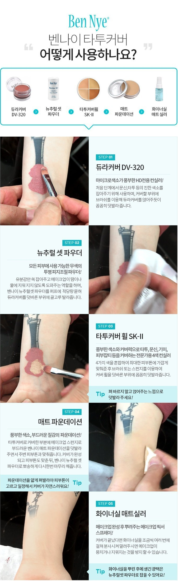 위 나온 제품들은 벤나이에서 판매되는 다른 제품인데요. 진한 색소를 잡기 위해 짙은 색상의 컨실러를 먼저 올려주고 파우더 처리를 해준 후 3번째 단계에서 타투커버 휠 제품으로 꼼꼼히 덮어줘요. 이후 파운데이션과 픽서로 고정시켜주면 더욱 자연스럽고 완벽하게 사용할 수 있답니다!